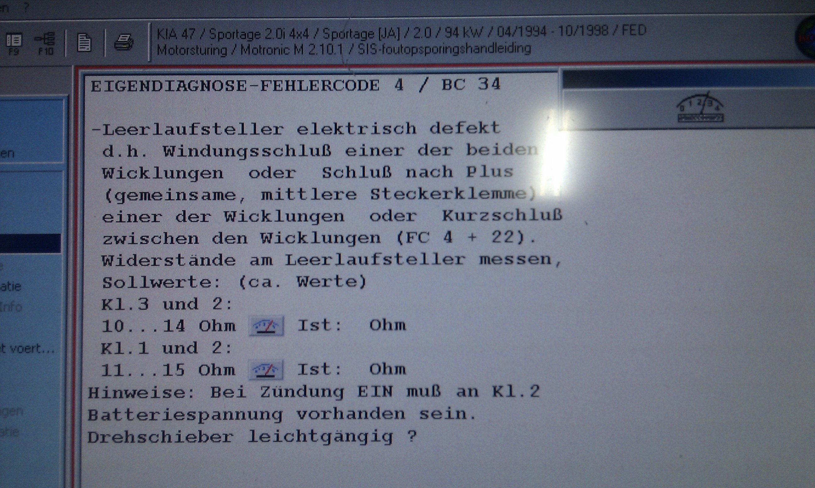 Afgelopen week moest onze Kia Sportage (1995) voor de APK. Nadat we de auto weer op hadden gehaald bleek de motor niet meer goed stationair te draaien, en tijdens het wegrijden zag ik dat het lichtje check engine aanstond. De garage kan pas volgende week de boel uitlezen dus dat is balen. Ik heb echter zelf het idee dat er een sensor los is geraakt o.i.d. Normaal hoorde ik de lucht ingenomen worden maar nu niet meer. Mijn vraag is waar kan ik deze sensor,die er volgens mij op zit, vinden, en/of wat kan de oorzaak nog meer zijn?