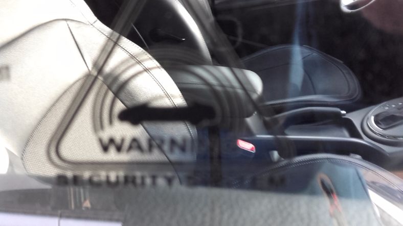 Goedemorgen, ik heb nogmaals gekeken en de waarschuwingsstickers zitten dus niet op het glas geplakt maar in het glas een bijde kanten , dus geen latere inbouw , tevens zitten er binnen in de auto een soort cameratje heel klein , zowel links en rechts , ik dacht zelf is voor de luidsprekers voor de telefoon , ook nog niet geprobeerd , zal straks wel even proberen om als de auto op slot zit deze met de sleutel te openen , laat het nog even weten -