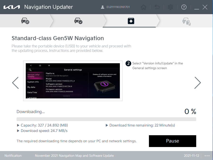 Als je het bestand hebt gedownload en hebt uitgepakt, zie je als het goed is 4 bestanden/mappen. Deze kopieer je naar de root van de usb stick. Als het goed is de update ongeveer 25gb (software + kaart). Nadat je de bestanden hebt gekopieerd ga je naar de auto. Start de auto en plaatst de usb stick in de auto, zorgt ervoor dat er geen andere usb sticks in de auto zitten. De update wordt gestart en je kiest voor normale update. Laat de motor draaien, want de update duurt een uur. Je krijgt meldingen in je Uvo app dat de motor draait maar die kan je negeren. Nadat het eerste deel van de update is voltooid, zet je de motor uit, je krijgt een melding om de software bij te werken, start opnieuw de motor en drukt op bijwerken. Dit bijwerken duurt ook zo'n 10 minuten. Na de update moet je even de privacy/gebruikersovereenkomst accepteren en je bent klaar. Advies is om zo snel mogelijke USB stick te nemen want het proces duurt lang.