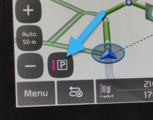 Wanneer ik in de buurt van mijn bestemming kom, verschijnt er links onder een vierkant blokje met de letter "P".