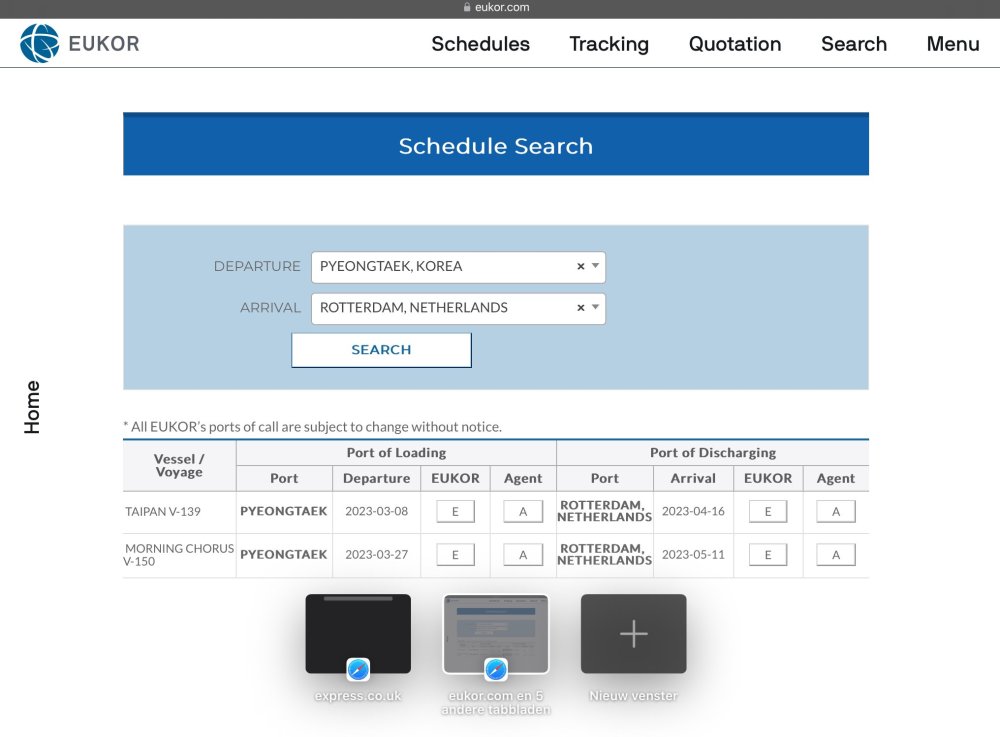 Op Eukor.com kun je de planning vinden, vanuit Pyeongtaek naar Rotterdam, maar ook van en naar andere havens. De Morning Chorus komt 11 mei in Rotterdam aan. Voor de door jou genoemde datum staat er geen aankomst in Nederland gepland. Misschien via Antwerpen?