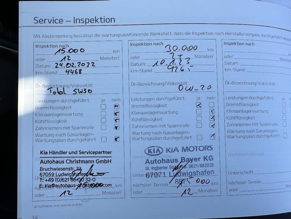 3. Hallo JJ Dooper, voor zover ik weet moeten de beurten sowieso bij een officiële Kia dealer zijn uitgevoerd en mag er een kleine spelling zitten in het aantal km's bij de beurten (paar honderd, geen duizend). Ook moet de KIA garantie sticker aanwezig zijn in het onderhoudsboekje. Ik weet dit omdat ik zelf van plan ben om een Kia Ceed GT uit Duitsland te gaan importeren naar Nederland. Dan moet dus echt alles kloppen omdat KIA Nederland dan de garantie moet overnemen van KIA Duitsland. In de bijlage wat voorbeelden!