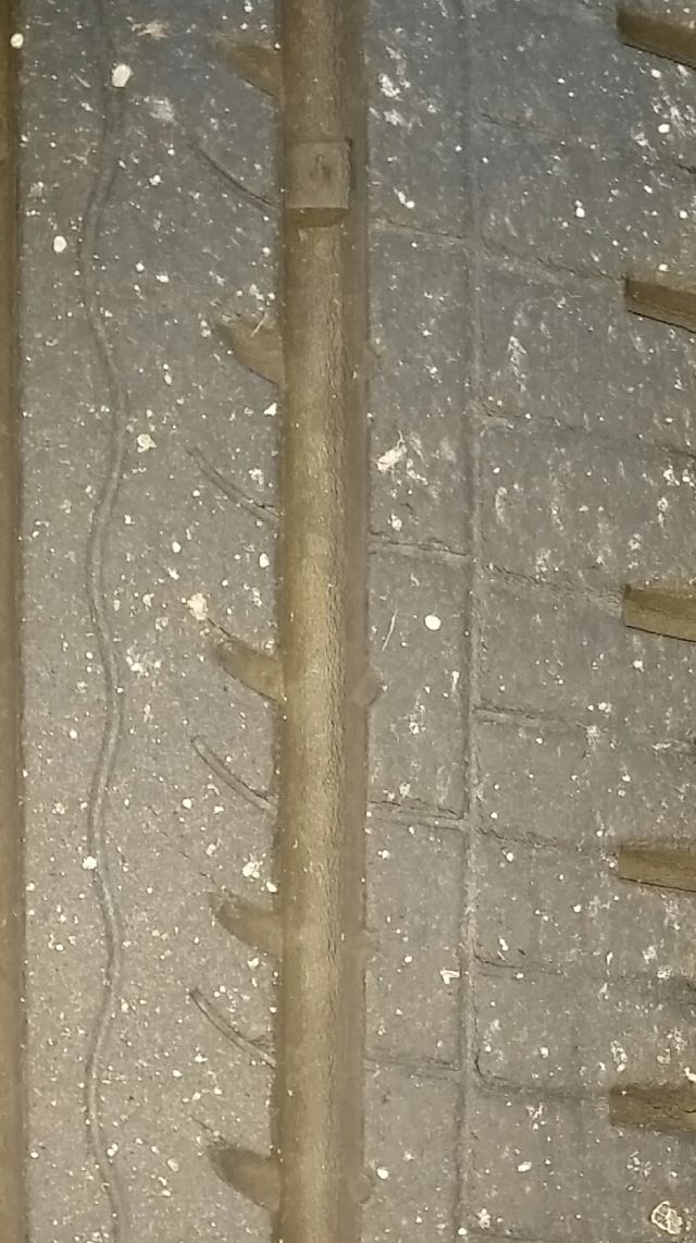 Dit is een apart stukje rubber van ongeveer 1,6 milimeter in de hoofdgroef. Zodra dit stuk rubber begint te slijten rijd je dus strafbaar in de rondte.