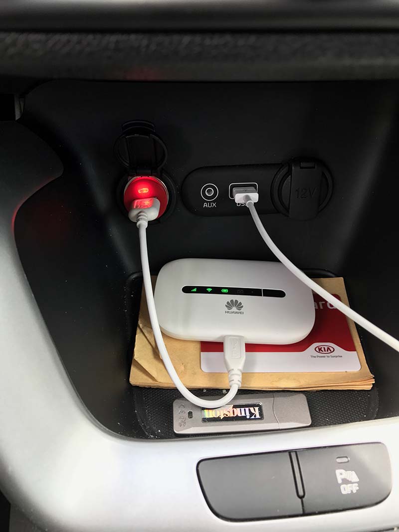 Ik heb mijn Huawei mifi (contstant) aangesloten op de 12V aansluiting in de armsteun. Zoals eerder aangegeven heb ik nog geen enkel probleem gehad ivm een lege accu.