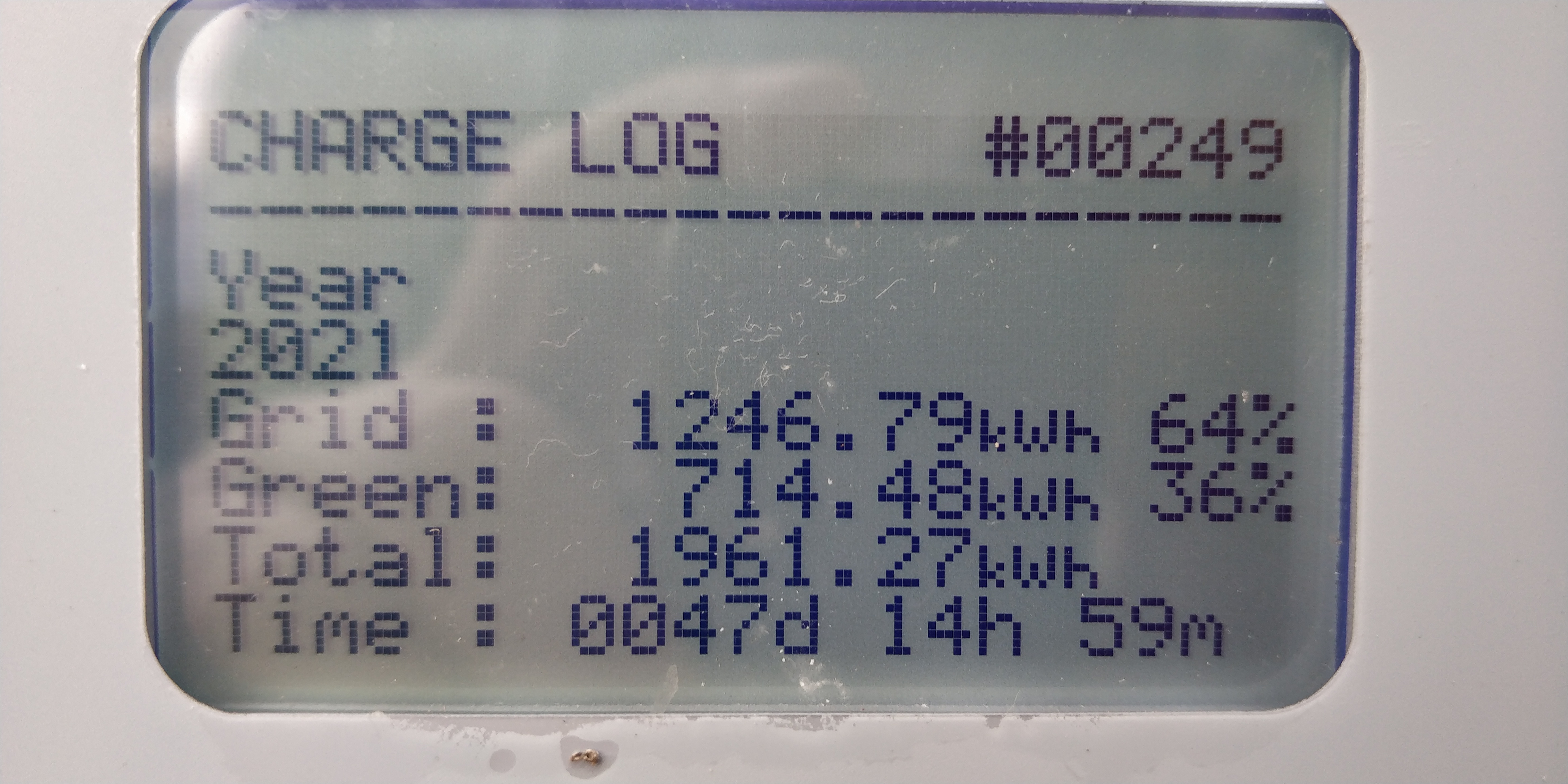 Chargelog voor YTD: over het hele jaar is het slechts 36% groen en dat zal dalen, maar dat komt omdat ik pas in april extra panelen heb geplaatst waarmee ik de auto beter kan laden en de Eco++ functie meer gebruik. Over 2022 verwacht ik meer solarcharging te doen want ik ga meer met de instellingen spelen. Denk aan Eco++ laden overdag en 's-nachts bijkoop tot bv 20kWh indien de accu niet op 40% zit. Dan hebben we altijd een mix tussen grid en green waarbij we green maximaliseren.