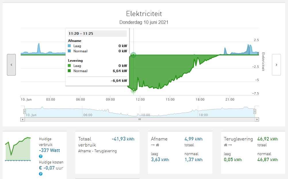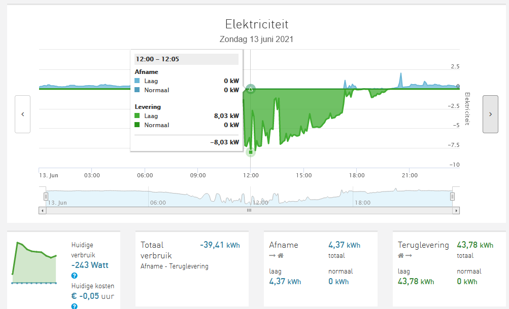 Op zondag 13 juni heb ik kortstondig een piek van 8kW gehad en dat kan in de winter ook wel eens gaan gebeuren want de panelen zijn dan lekker koud.