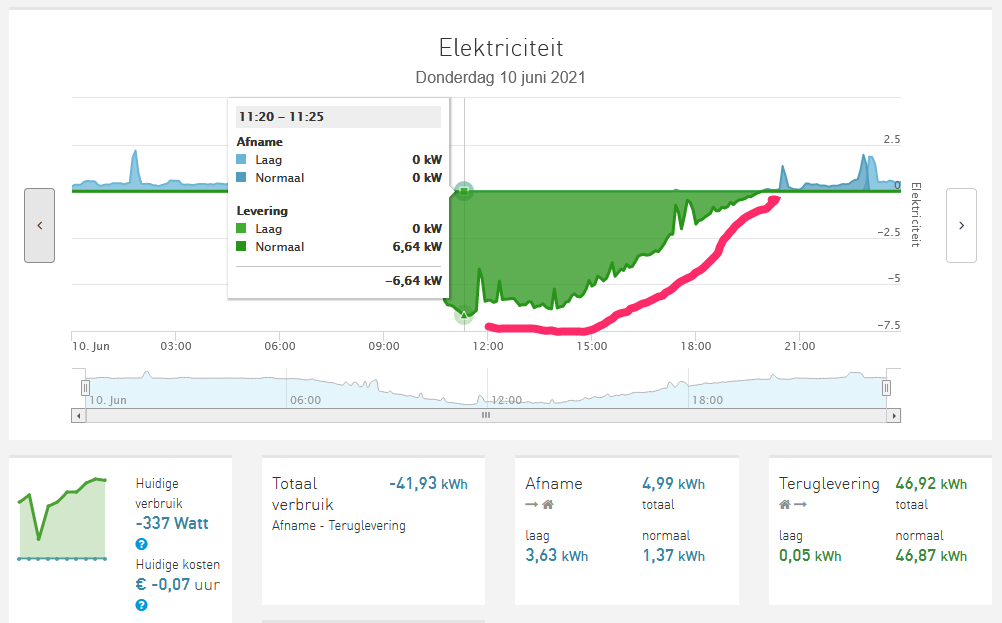 10 juni was een mooie zonnige dag met een opwek van bijna 47kWh maar helaas een demping toen de zon op z'n hoogst stond.