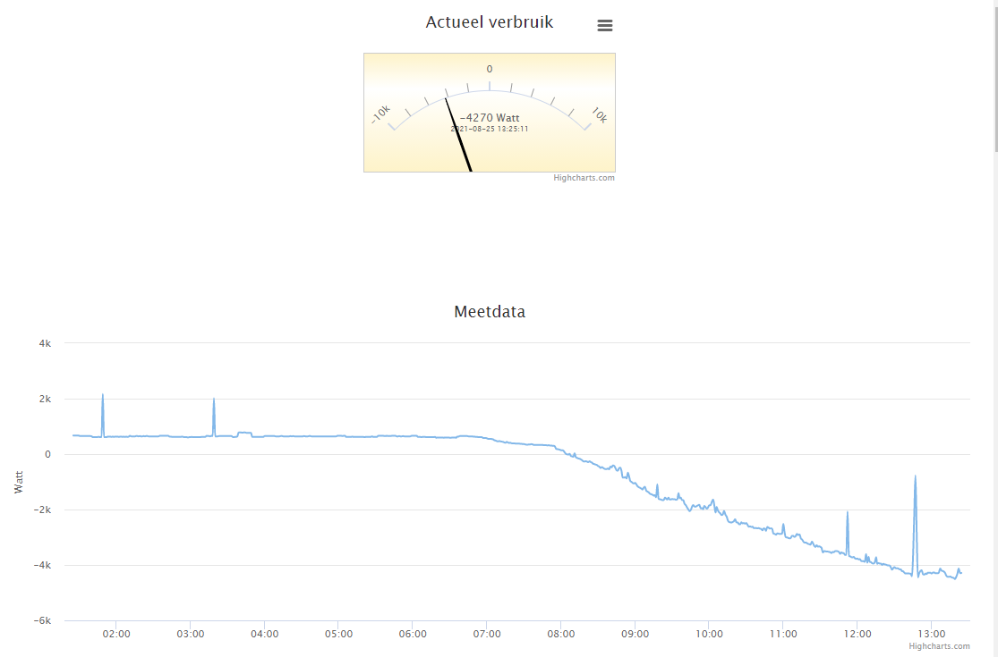 Wat minder fancy, maar het voldoet (ik log alleen de data, dit is een simpel zelfbouw schermpje) Dit is wel rechtsreeks uit de meter, dus wat er de deur uit gaat dus eigen verbruik is er al af. Zonder laden uiteraard, maar 3 continu draaiende vijverpompen slurpen best wat weg.