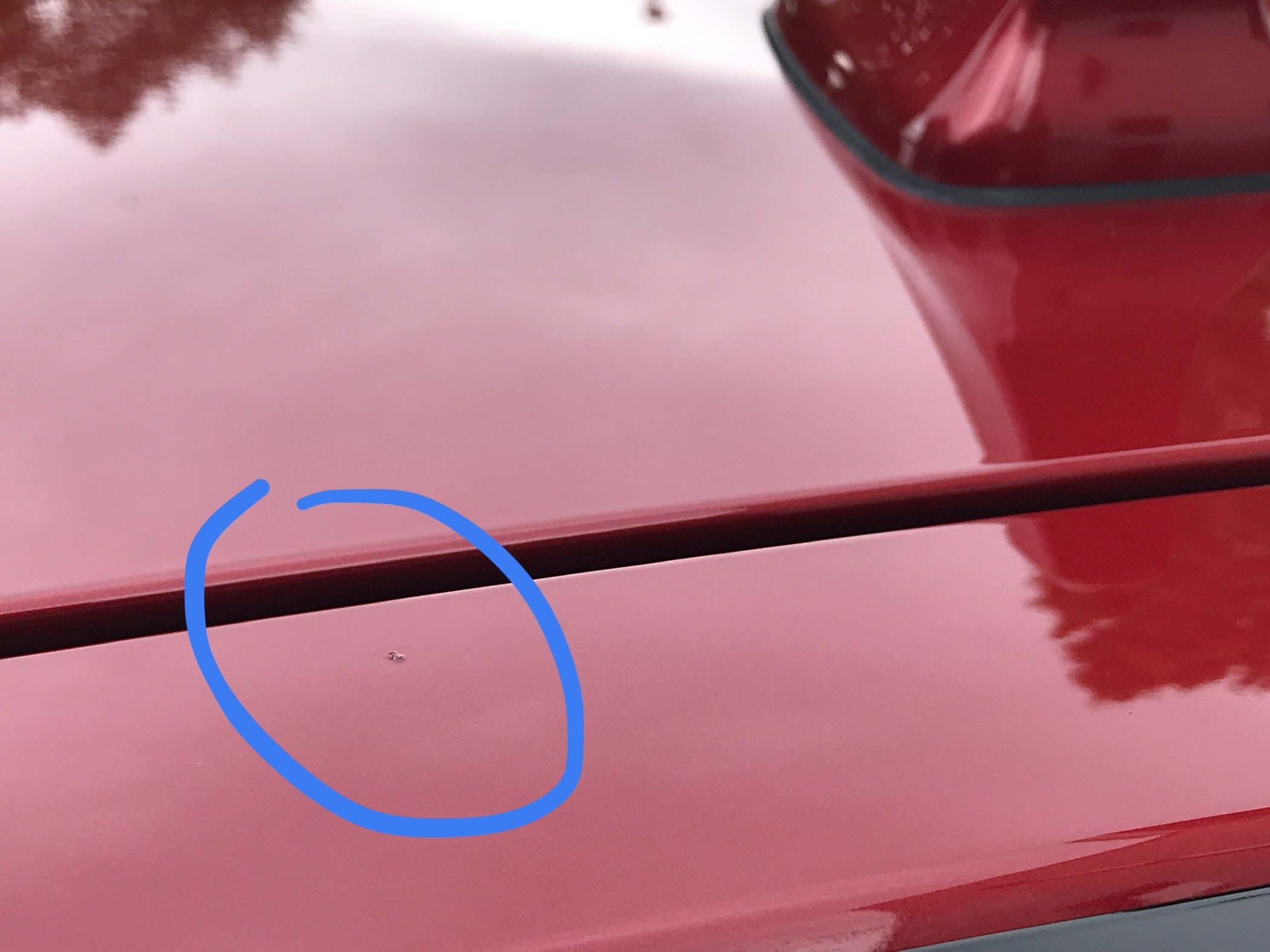 Even een vraagje wat jullie hiervan vinden. Er blijkt een rare lakfout, een bobbel, een spetter, te zitten bovenop de achterklep, net vóór de spoiler. Wat doe je daar nu mee. Rustig laten zitten of klagen bij de dealer en vragen om er wat aan te doen?