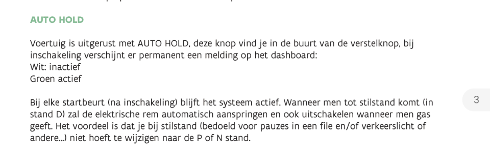 Ik heb de AutoHold gisteren en vandaag is getest en bij het langer wachten voor een stoplicht is het best even handig hetzelfde geld bij een spoorwegovegang, maar bij het inparkeren moet je dan eerst je voet op het gaspedaal zetten om zachtjes vooruit of achteruit te rijden, moet je dan plots remmen omdat je er bijna bent dan moet je eerst je voet van het gas afhalen en dan op de rem, dit kan soms net te lang zijn voordat je de auto voor je of achter je raakt. Als je inparkeert zonder AutoHold dan heb je direct je voet op de rem en kan je veel meer gedoseerd naar achter of naar voren rijden en gebruikt je maar 1 pedaal en is de reactietijd dus ook veel korter.