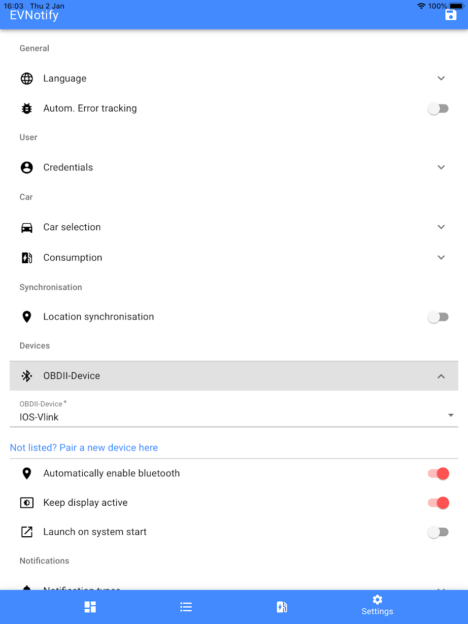 @Fralamjo Ik heb hier twee OBD-pluggen (via Ali) die met BT4 zouden moeten werken. Met geen van beide kan ik vanuit EVNotify koppelen. Bij de instellingen staat in blauw de regel “Not listed? Pair a new device here”. Wanneer ik daarop tik verschuift het beeld een stukje naar beneden, maar koppelen of iets wat daartoe kan leiden lukt niet.