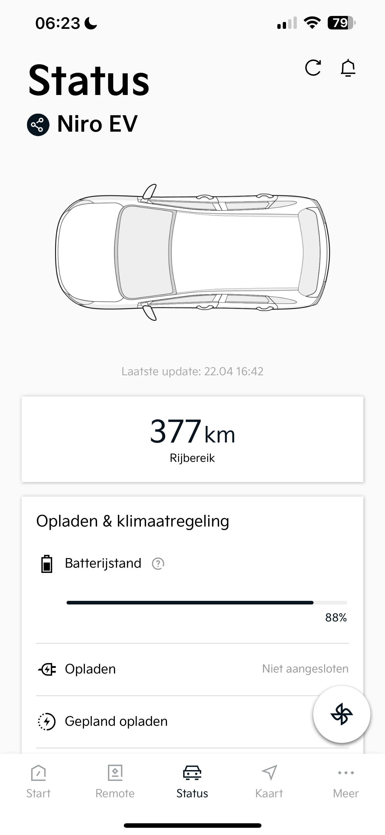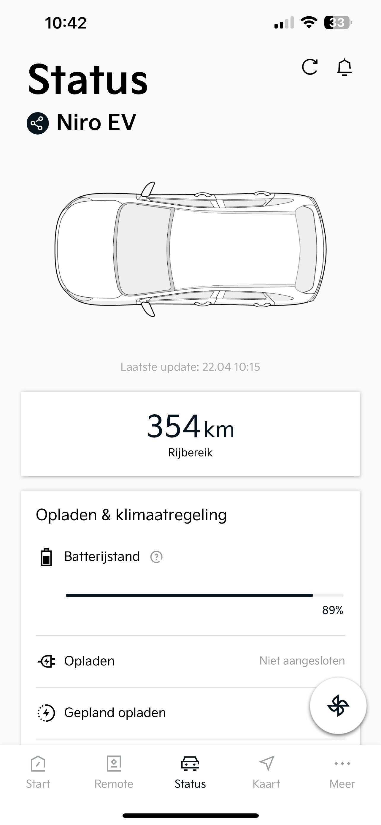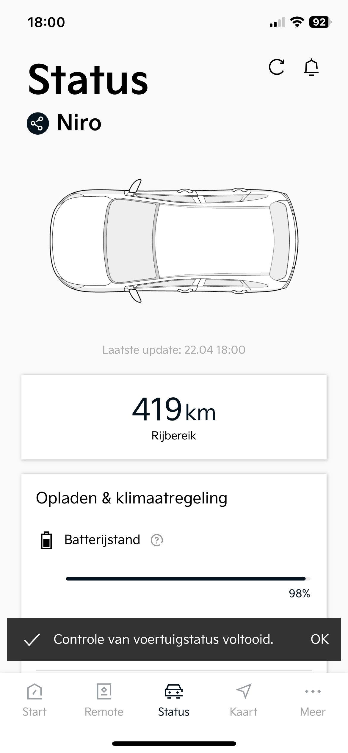 Vanmorgen gereden en merk op dat hij de laatste update ontvangt zodra ik de auto weer uit zet. Kwam om 10:13 uur aan en mijn laatste update is van 10:15 uur. Dat geeft die heel netjes door, maar verder werkt het jammer genoeg niet bij mij. Kan geen status aanvraag doen of remote aanklikken. Gewoon even ter info voor Kia Connect :)