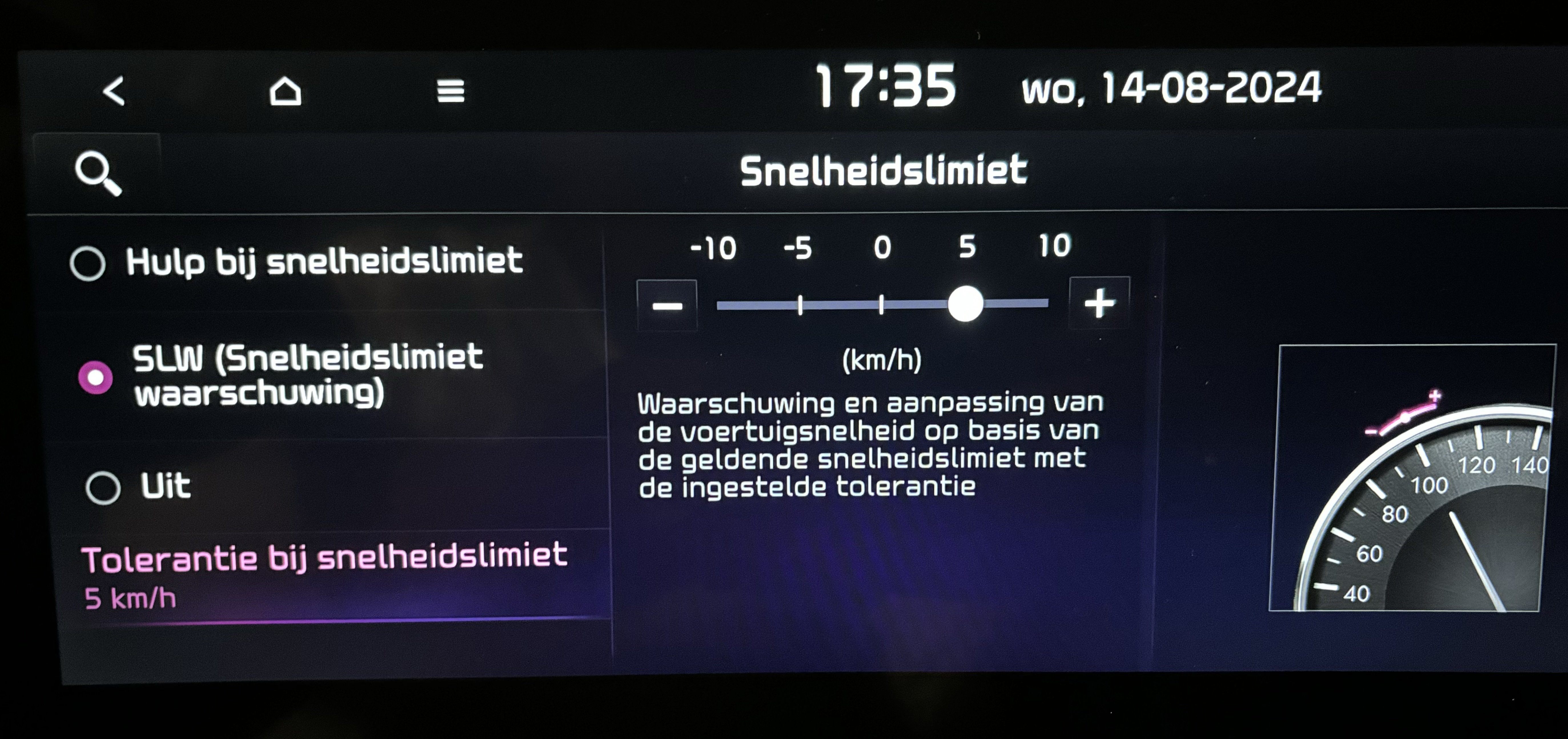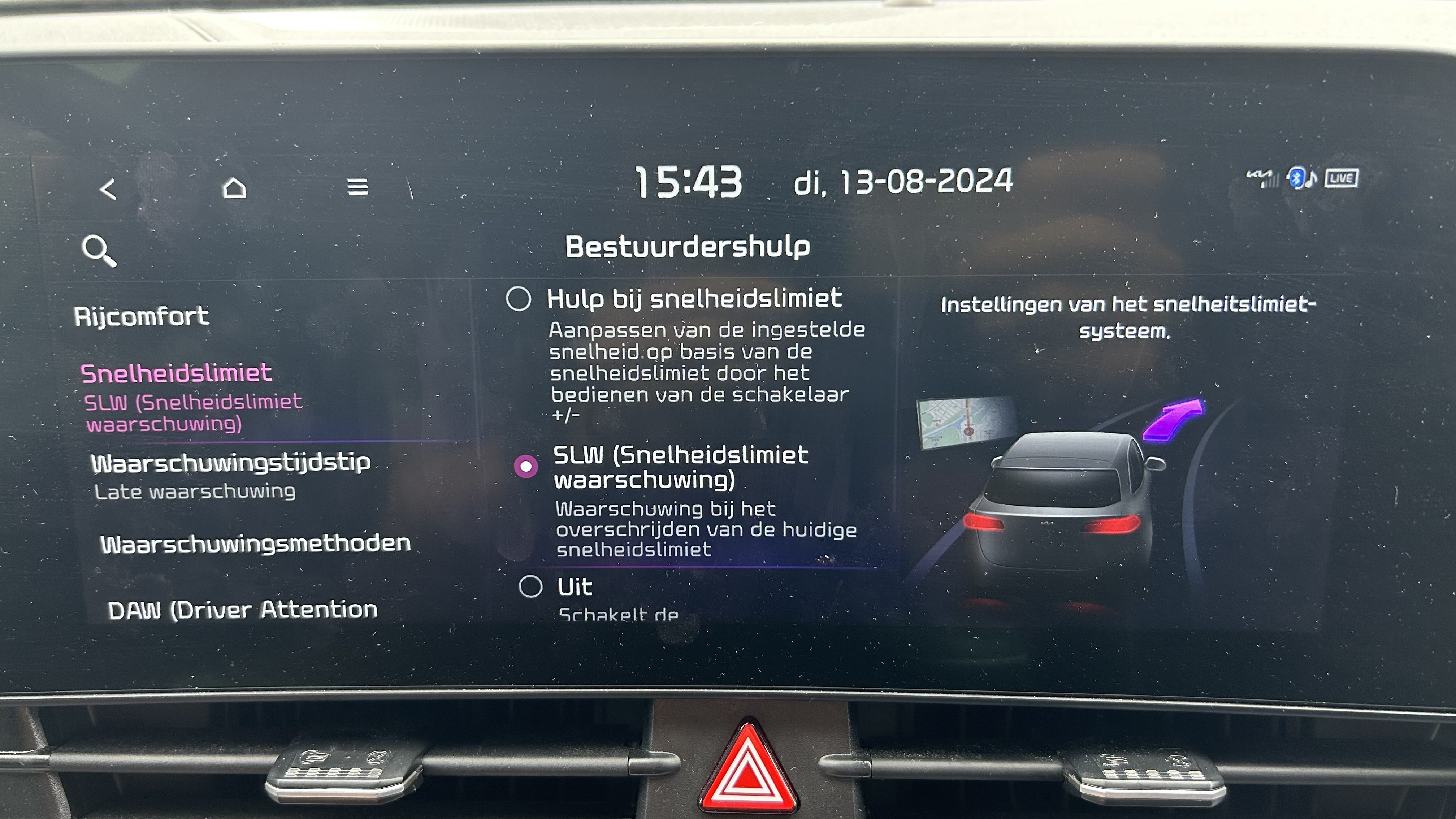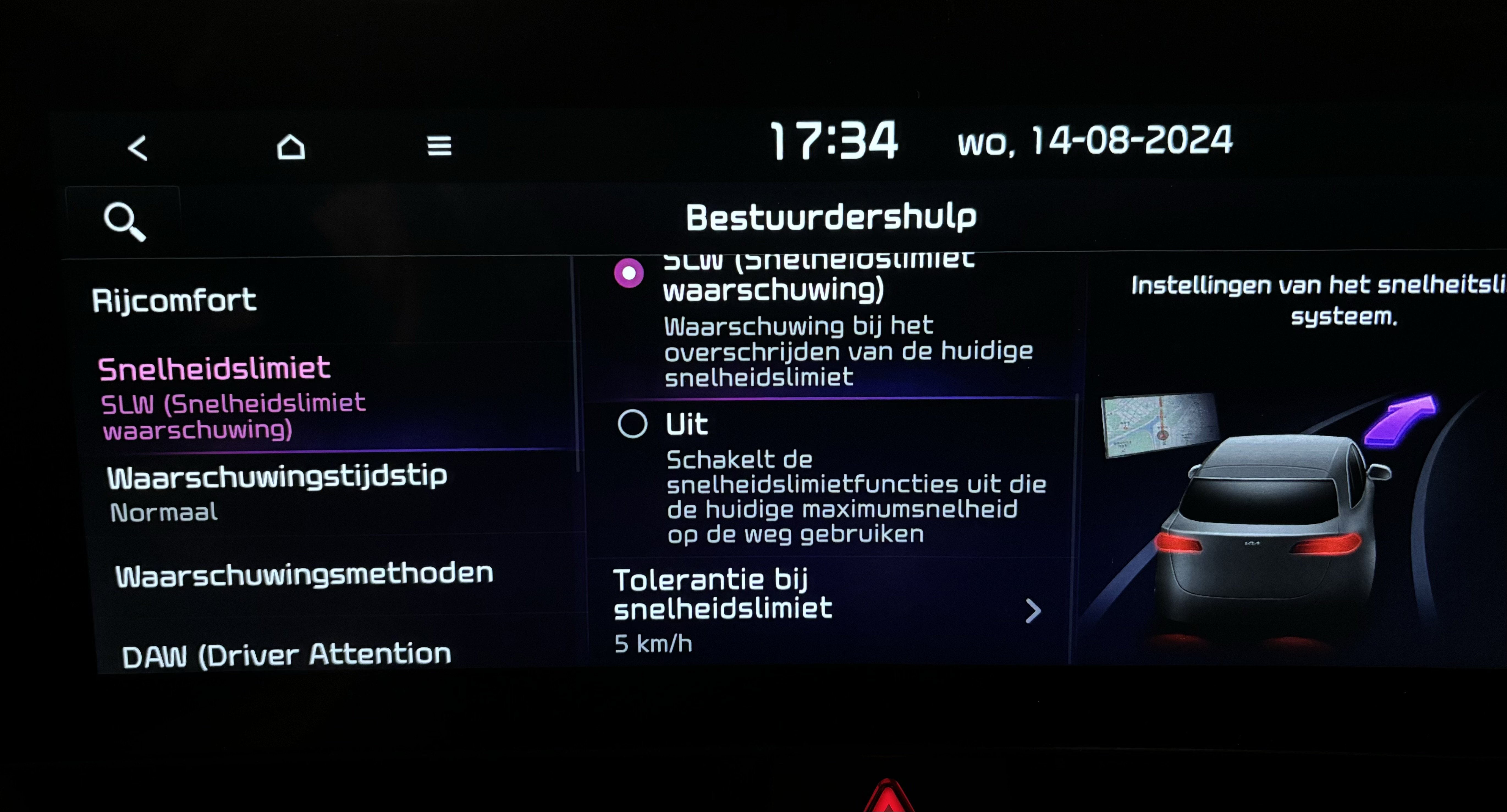 Faab Geplaatst 14 Augustus, 2024 Geplaatst 14 Augustus, 2024 On 8/13/2024 at 1:36 PM, Wim-A said: Zie ook mijn eerdere reactie. Dat probleem van 120 na 19 uur etc is maar op 1 manier op te lossen: op dat moment je cruisecontrol handmatig op 120 zetten. Maar de 'snelheidspiepjes' zijn iets anders dan de roodlichtwaarschuwingen. Ik heb overigens niet de optie van "Speed limit information" zoals getoond in de plaatjes op de KIA update site. Ik heb alleen"Hulp bij snelheidslimiet", " SLW (Snelheidslimiet waarschuwing" en "Uit". (zie bijgevoegd screenshot) Zal dat de reden zijn dat dit niet (anders) werkt bij mij dan zoals beschreven op de KISA update site? Quote