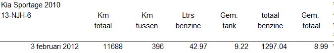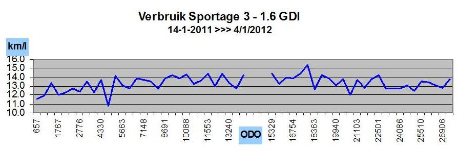 Ik heb mijn Sportage 3, 1.6 GDI, panoramadak, trekhaak nu een jaar in mijn bezit. De auto bevalt mij uitstekend en ik herken geen van de problemen die in dit forum veelvuldig zijn genoemd (stuurbekrachtiging ed.) In deze periode heb ik ruim 27000 km gereden. Van alle tankbeurten, welke bijna allemaal bij dezelfde pompstation zijn gedaan heb ik de ODO en de getankte liters netjes bijgehouden. Wijze van aftanken was altijd hetzelfde: bij 1e afslag stoppen.
