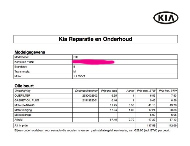 Wat ok raar vindt is dat de prijs via mij kia €142 is dus voordat ik een dealer kies waar ik de beurt wil laten doen. Ik ga maandag toch de dealer eens bellen. De auto staat gepland voor 26 april.
